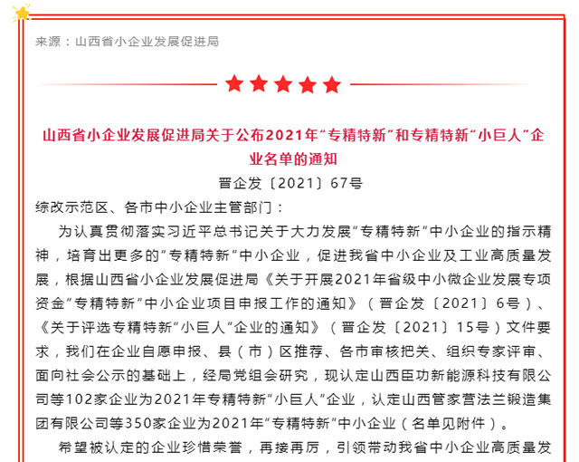 祝贺国源公司获得山西省2021年“专精特新”中小企业荣誉称号