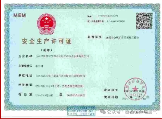 近日,经太原市应急管理局审批,国源公司新获“金属非金属矿山采掘施工作业安全生产许可证”。该许可证的获得,为公司拓宽业务提供了有力支撑和保障,为推动企业创造新的经济增长点打下了良好的基础。