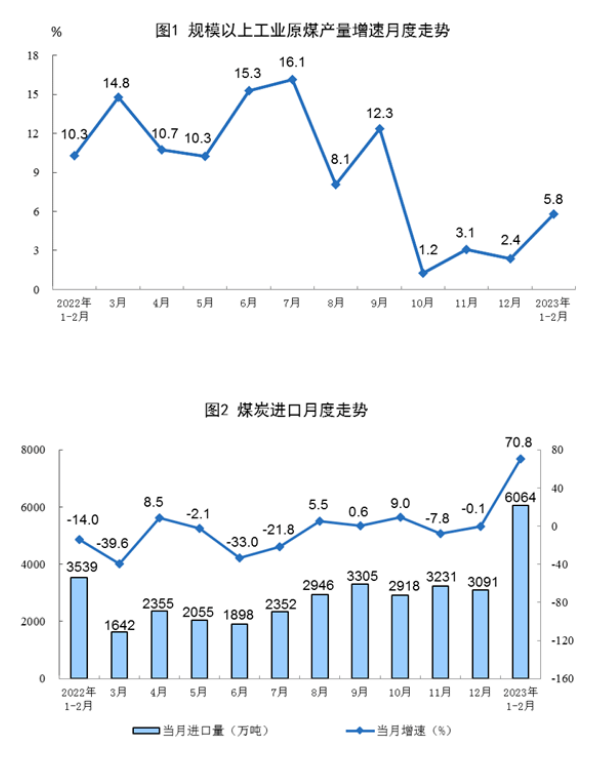 原煤生产较快增长,进口大幅回升。1—2月份,生产原煤7.3亿吨,同比增长5.8%,增速比上年12月份加快3.4个百分点,日均产量1244万吨。进口煤炭6064万吨,同比增长70.8%,上年12月份为下降0.1%。