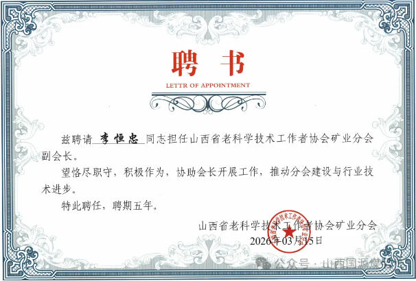 近日,山西省老科学技术工作者协会矿业分会成立大会在太原隆重召开,会议选举产生了矿业分会第一届领导机构。国源公司董事长李恒忠凭借在矿业领域的深厚积淀与行业贡献,成功当选为山西省老科学技术工作者协会矿业分会副会长并获聘为专家库专家,国源公司荣膺“团体会员单位”。